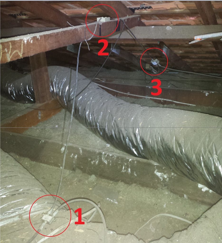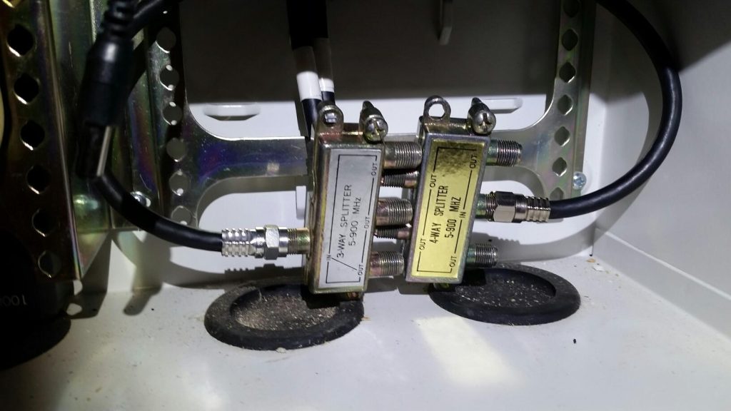 Alexander Heights – 2 way splitter, piggy backed off old 4 way splitter which runs off another 2 way splitter. Excessive signal loss causing reception faults