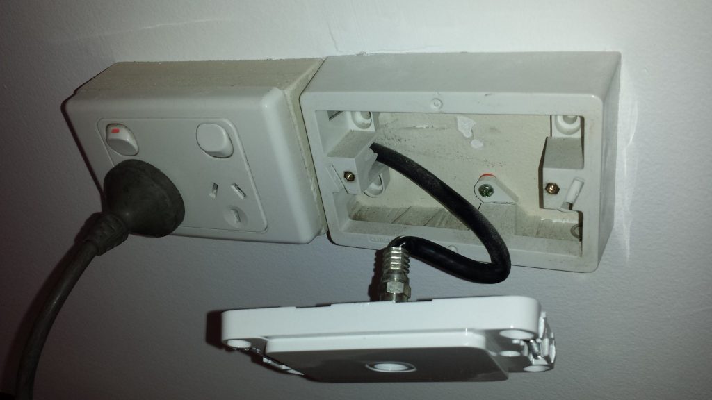Scarborough – Illegal coax cabling, ran through same hole in wall as power point. Kinked cabling at wallplate